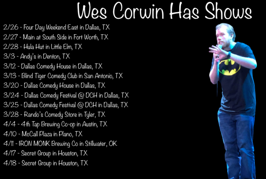 If you’re in need of a laugh (singular, I offer one laugh per show), I have shows coming up all over Texas (and one in Oklahoma!)